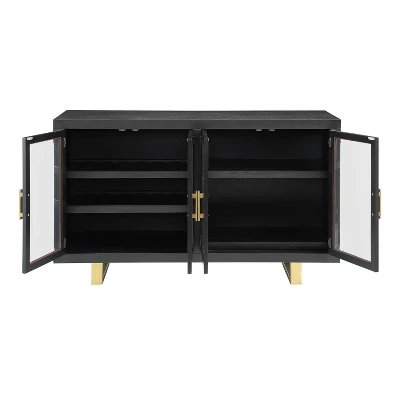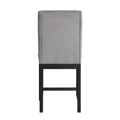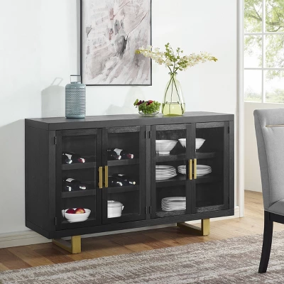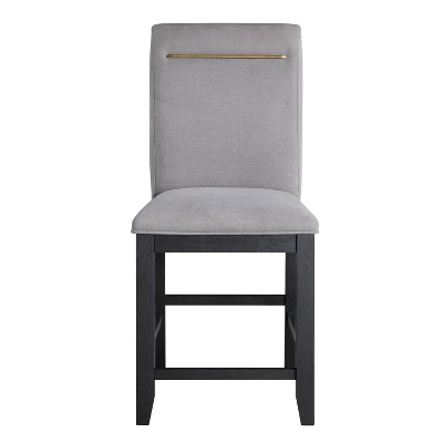 Clean modern living just got a lot easier with the contemporary styling of the Yves 8pc Dining Set. The 77″ dining table features sturdy wood construction in a rubbed charcoal finish that is both sleek and warm. The table easily extends to a spacious 95″ with the addition of the 18″ leaf (included). The matching counter chairs feature a gray performance fabric designed for inherent durability and longevity. Spills bead up, until they are gently blotted for cleanup; this fabric is also moisture repellent, stain-resistant and designed for heavy-duty wear with barrier protection to keep it clean. The solid wood base and legs in the rubbed charcoal finish combine with a gold-colored accent on the back cushion to provide a look that is both sleek and warm. The matching server features a gold sled base and gold hardware with four glass doors revealing two shelves for display or storage and two shelves for bottle storage. Your purchase includes one dining table with leaf, 6 counter chairs and one server.