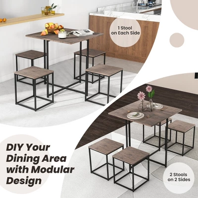 - Space Saving Design: Thanks to the clever cross-shaped design of the compact 31.5” x 31.5” x 31” dining table, the four 14” x 14” x 17.5” stools can easily be placed under the table when the meal is over, thus greatly maximum the space utilization. So, this 5 pieces table and chair set is a perfect choice for small spaces!