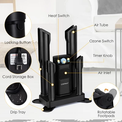 - 2 Pairs Simultaneously: Four shoe brackets enable you to dry 2 pairs of shoes at the same time. And four drip trays can catch the dripping water and prevent the ground from getting wet. Furthermore, the four tubes with extendable design make the dryer ideal for multiple garments, such as shoes, socks, hats and gloves.