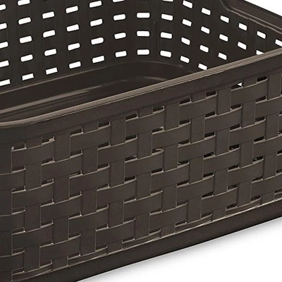 Storage organization shouldn’t be complicated. Simplify your storage with the 8-pack Sterilite Small 11-Inch Long Weave Home Storage Basket Organizer. Measuring 11.5-inches long, 8.75-inches wide, and 4-inches tall, the small weave basket combines the decorative look of wicker with the convenience of easy-to-clean, durable plastic. The weave pattern adds a fashionable touch to every day storage for items kept out in the open. Rectangular in shape, this basket is ideal for reducing clutter on countertops, pantries, bookshelves, entertainment centers and more. When used with other storage baskets, this item can create a customized storage solution that fits any household needs. A reinforced rim provides a great gripping location for lifting and transporting contents. Make your life easier with the 8-pack of Sterilite Small 11-Inch Long Weave Home Storage Basket Organizer.